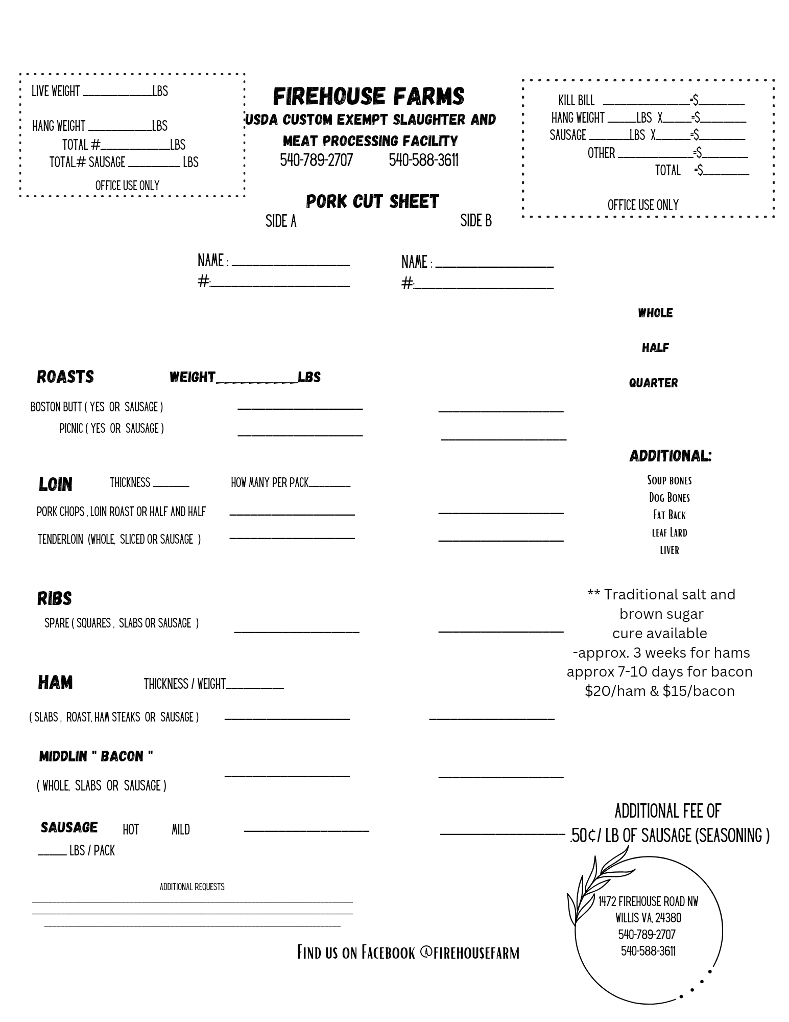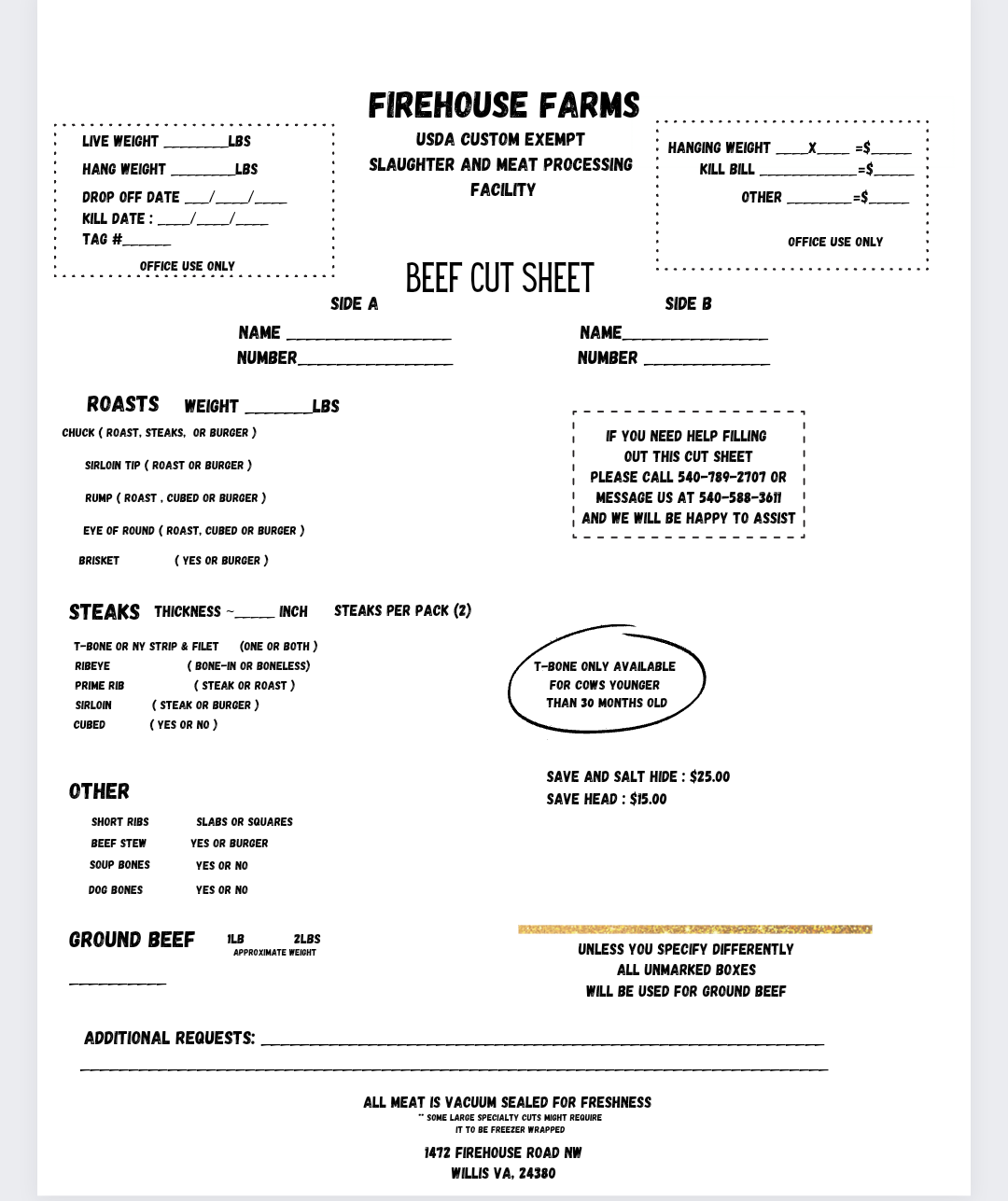 Here at Firehouse Farms we offer everything under one roof, you can bring your livestock to us and have it slaughter processed and packaged, and we also will be selling our own pasture raised hogs and cattle to purchase in whole, half, or quarter. You have a choice in what cuts you want and we can customize some of the cuts as well if desired. Your meat will come vacuum sealed ( 5 mil bags ) and ready to throw in the freezer.